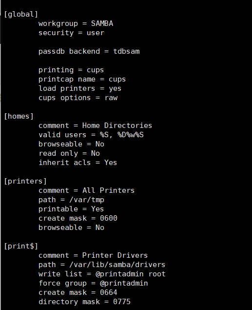 说明:samba配置文件目录/etc/samba smb.conf为核心配置文件