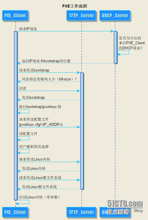 PXE(Pre-boot Execution Environment,预启动执行环境)是由Intel公司开发的最新技术,工作于Client/Server的网络模式,支持工作站通过网络从远端服务器下载映像,并由此支持通过网络启动操作系统,在启动过程中,终端要求服务器分配IP地址,再用TFTP(trivial file transfer protocol)或MTFTP(multicast trivial file transfer protocol)协议下载一个启动软件包到本机内存中执行,由这个启动软件包完成终端基本软件设置,从而引导预先安装在服务器中的终端操作系统。